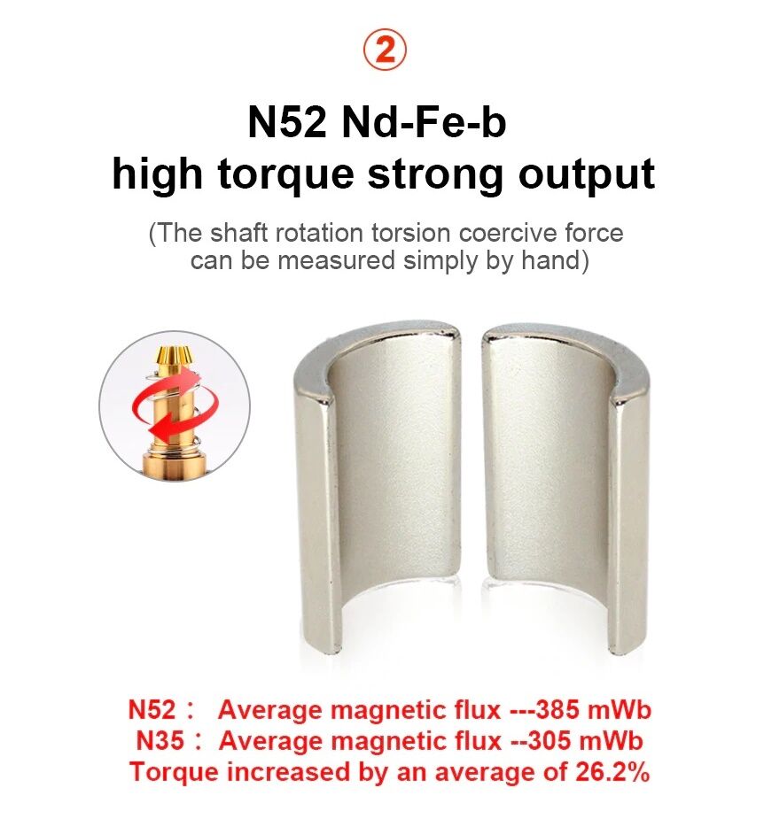 – Nam châm: Neodymium Magnet N52 (NdFeB), cũng cấp từ trường mạnh hơn 20.8% và mô men xoắn cao hơn 26.2% so với Nam Châm Neodymium Magnet N35 thông dụng.