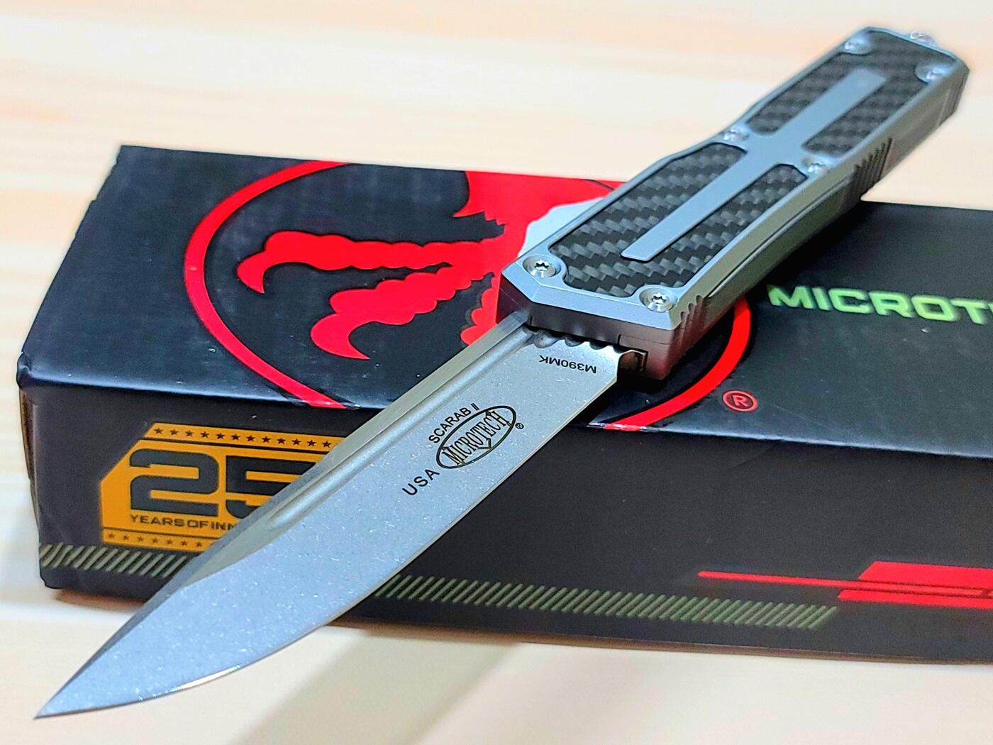 Thông tin về dòng dao Microtech Scarab: Microtech Scarab là một dòng dao chiến thuật chất lượng cao, được sản xuất dựa trên thiết kế ban đầu của dòng dao Microtech Ultratech. Scarab được thiết kế theo tiêu chuẩn cao nhất có thể để đảm bảo độ tin cậy và an toàn khi sử dụng. Nổi bật với thiết kế dùng một tay, mở và đóng hành trình kép, tay cầm lớn kèm các lớp lót chống trượt ở cả hai bên. Nó được thiết kế để chịu được các điều kiện khắc nghiệt, Scarab vượt trội trong các hoạt động bí mật cường độ cao, hỗ trợ tốt trong tác chiến tầm gần. Đây là dòng dao được sản xuất để phục vụ cho quân đội, các cơ quan thực thi pháp luật và chính phủ Mỹ.