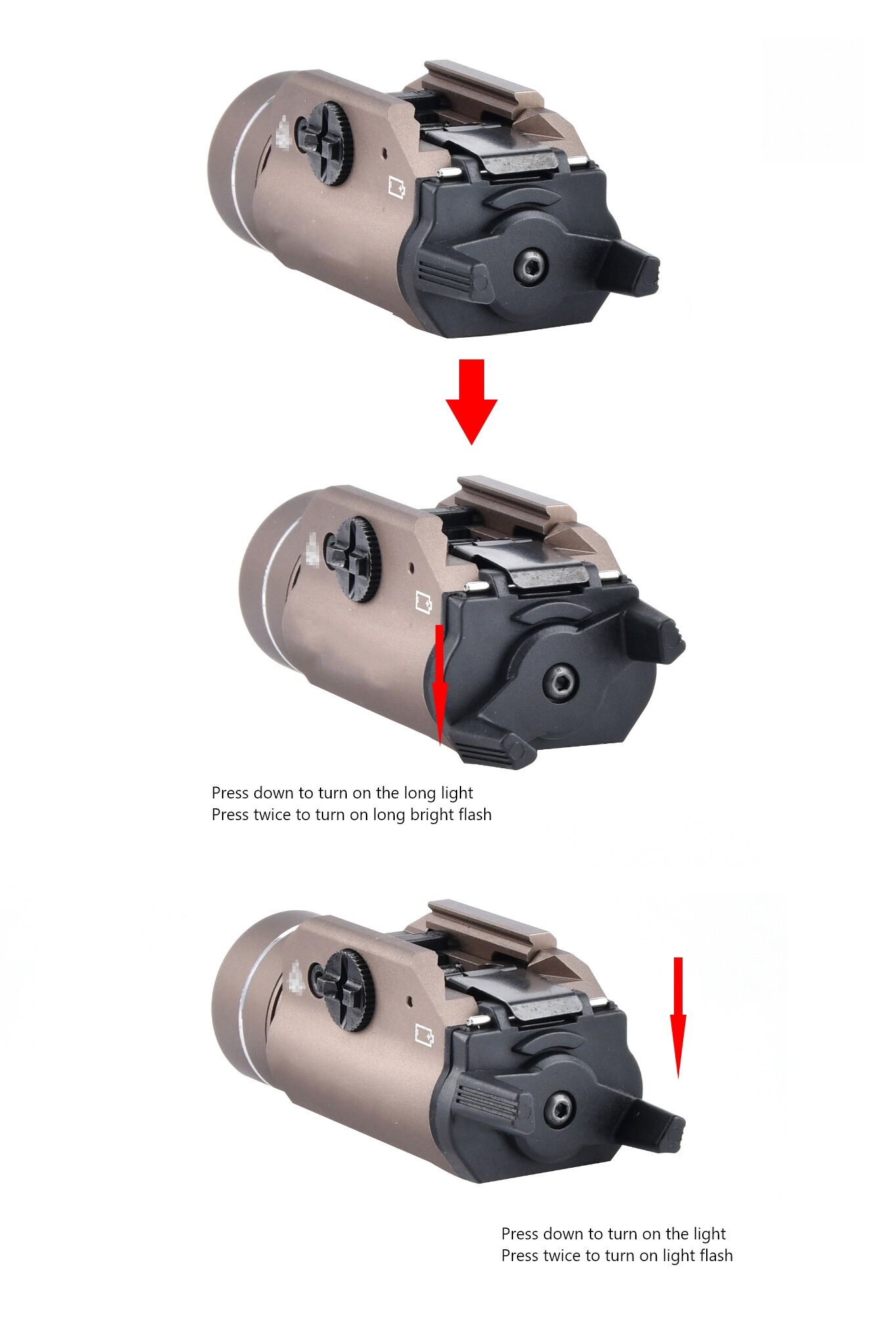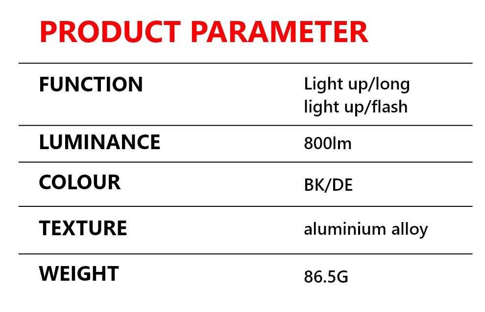 – Chế độ sáng: 3 Modes (Sáng liên tục/Nhấn giữ để sáng/Strobe).
